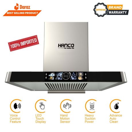 Hanco Smart Voice Control Kitchen Chimney (Hanco T-111) – Hand Motion Sensor & LED Touch – 90°C Auto Clean – Heavy Suction SS Body Range Hood