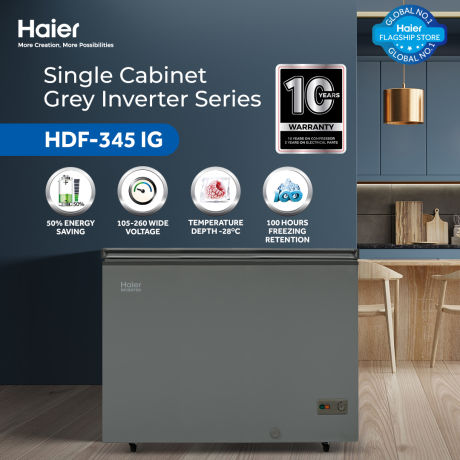 Haier 12.9 Cu Ft - HDF-345 IG - Inverter - Single Door Series - ( Inverter + Balanced Cooling + Super Freeze Function + Ref & DF Adjustable ) Grey Colour Deep Freezer- 10 Years Brand Warranty