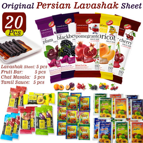 20 Pcs Deal Set Torshi Sevan Original Persian Lavashak Fruit Leather Sheets ready to eat box Fruit Bar Churan Chat Masala Powder Tamil Irani Imli Sauce Iranian Zarin Tala Torsh Fruity Bars Roll Sheet Souce Choran Candy Snack Chooran Chaat Viral Lava Shak