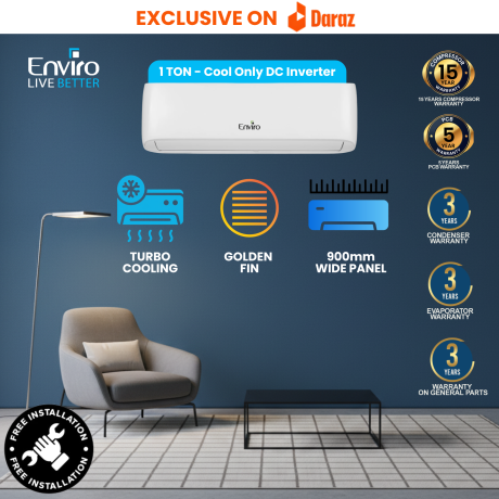 Enviro 1 Ton Inverter AC Cool Only– 12000 BTU DC Split Air Conditioner (EAC-12A Cool) | Turbo Cooling | Energy Saving | R32 Refrigerant | Golden Fin | Quiet & Durable | Best 1 Ton AC for Home & Office | 15 Years Compressor Warranty – White