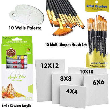 28 Pcs/Set Value Pack For Artist - Canvases, Acrylic Paints, Multi Shape Brushes and 10 Wells Palette - KC