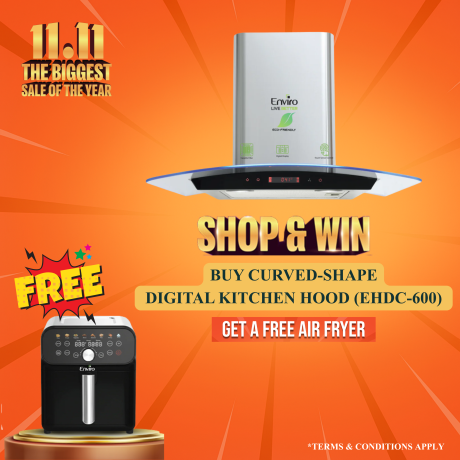 Enviro 60cm Digital Kitchen Hood (EHDC-G600) – Touch Control, Curved Glass Chimney Hood, 120W Powerful Suction, Low Noise ≤69dB, LED Lights, Stainless Steel, Easy Clean Filter – Best Range Hood for Pakistani Kitchens