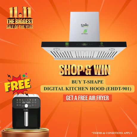 Enviro 90cm Digital Kitchen Hood (EHDT-901) – T Shape Chimney Hood, Touch Control, Digital Display, 200W Powerful Suction, Low Noise ≤70dB, LED Lights, 3 Stainless Steel Filters, Wall Mount, Energy Efficient