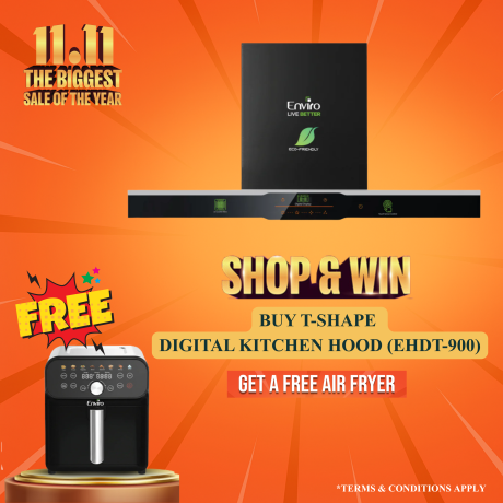 Enviro 90cm Digital Kitchen Hood (EHDT-900) – T Shape Chimney Hood, Touch Control, Digital Display, 200W Powerful Suction, Low Noise ≤70dB, LED Light, Dual Cassette Filters, Wall Mount, Energy Efficient