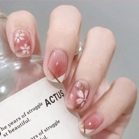 24Pcs White Simple Peach Flower Blossom Fake Nails with Glue DIY Art Design False Nails Wearable Nails Stylish Pattern Artificial Nails